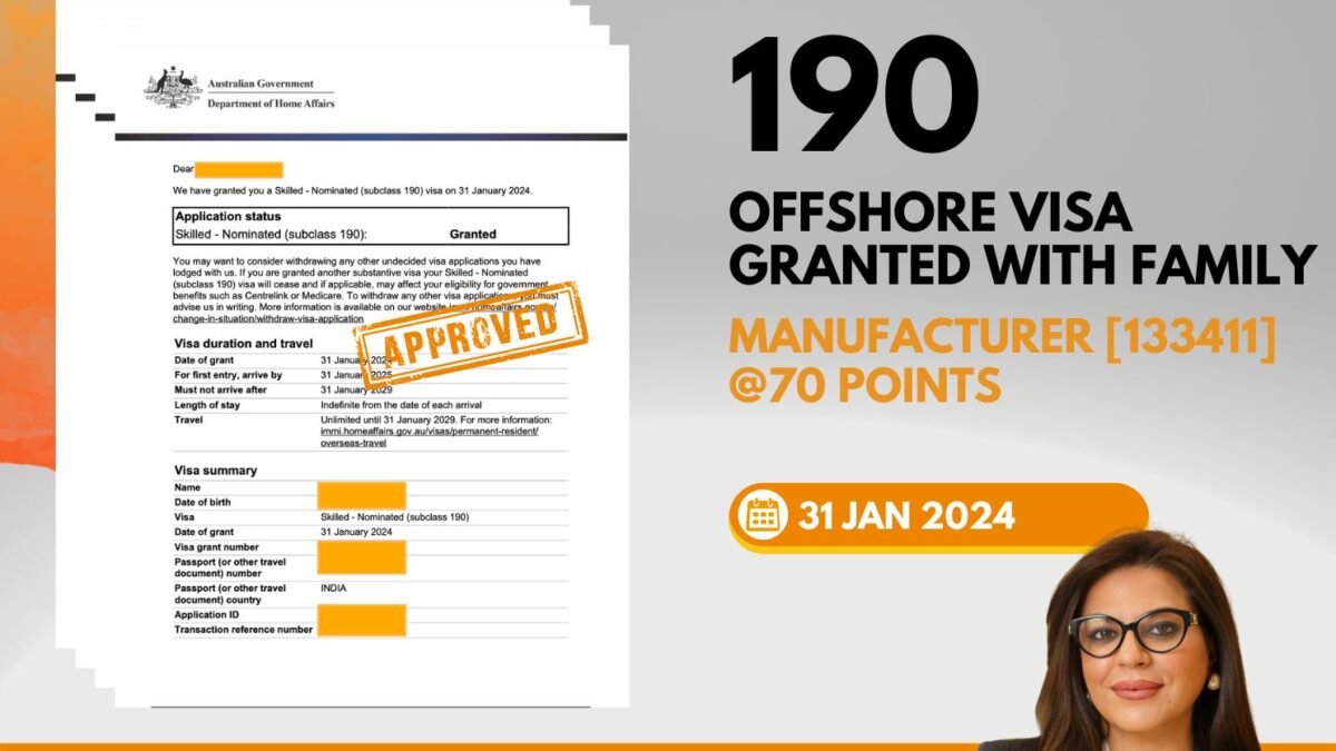 AUSTRALIA 190 Offshore Visa Granted With Family for Manufacturer[133411] @70 Points.