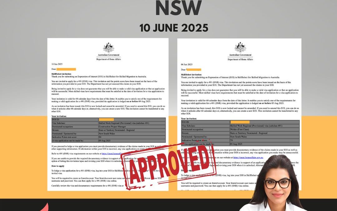 On 10th June 2025, two skilled applicants received their Subclass 491 Skilled Work Regional visa nominations from New South Wales (NSW) — guided by the expert team at CAANWINGS Consultants Pvt. Ltd., led by Ms. Diamond Sodhi.