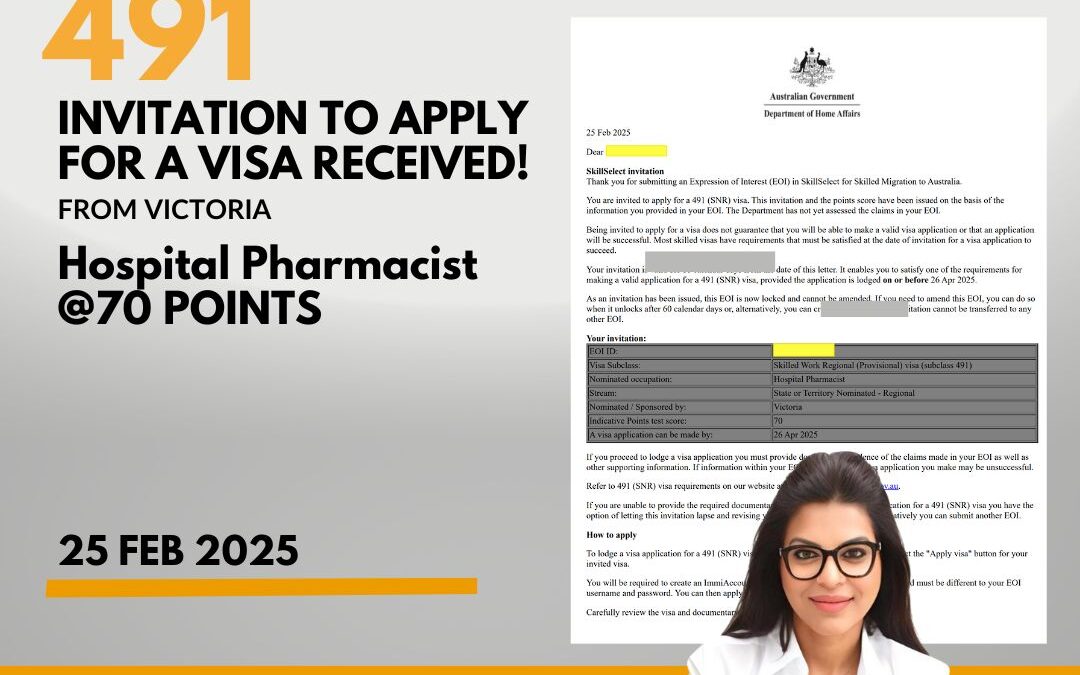 With the guidance of Ms. Diamond Sodhi, Caanwings reaffirms its commitment to being a trusted name in Australian skilled migration, has proudly secured yet another Subclass 491 Visa Invitation to Apply (ITA) โ this time for the highly regarded occupation of Hospital Pharmacist. This achievement highlights the teamโs ongoing commitment to guiding skilled professionals through Australiaโs complex migration pathways with clarity and confidence.