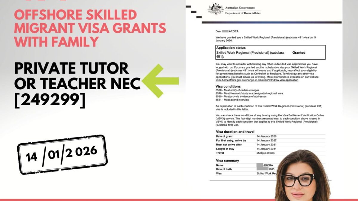 Australiaโs regional migration program continues to create meaningful opportunities for skilled education professionals worldwide. Caanwings Consultants Pvt. Ltd. is proud to share another successful outcomeโan Australia Subclass 491 Offshore Skilled Migrant Visa Grant with Family under the occupation Private Tutor or Teacher (NEC).