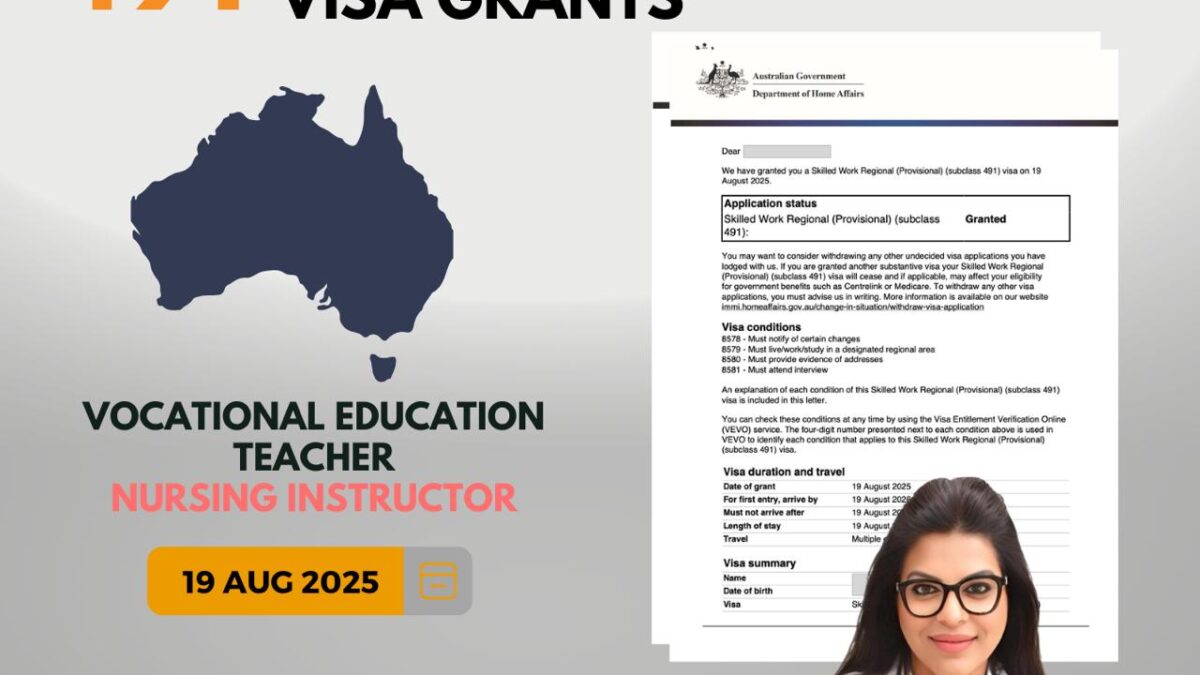 Australia continues to welcome skilled professionals who can contribute to the growth of its economy and communities. One of the most recent achievements is the successful Australia 491 Offshore Skilled Migrant Visa grants in the occupation of Vocational Education Teacher, proudly facilitated by Caanwings Consultants Pvt. Ltd., led by Ms. Diamond Sodhi.