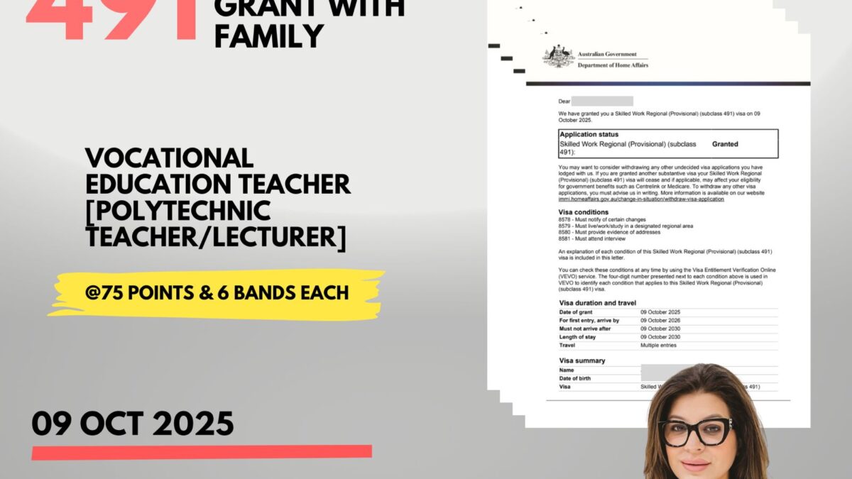 A proud moment for Caanwings Consultants Pvt. Ltd., as yet another skilled professional has achieved success under the Australia 491 Offshore Skilled Migrant Visa, this time in the esteemed occupation of Polytechnic Teacher/Lecturer, accompanied by their family. This achievement was made possible through the expert guidance and dedicated support of Ms. Diamond Sodhi, the driving force behind Caanwings Consultantsโ consistent migration success stories.