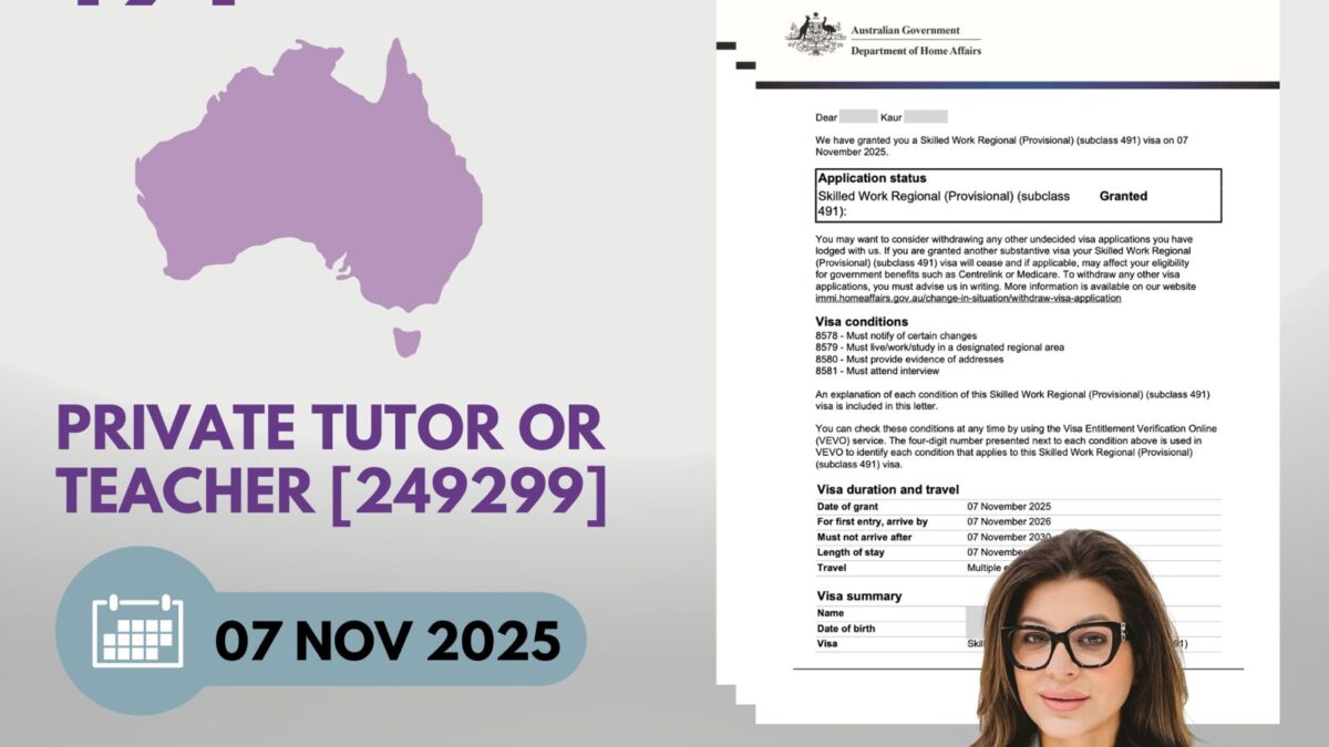 Caanwings Consultants Pvt. Ltd. proudly announces another remarkable achievement โ the Australia Subclass 491 Offshore Skilled Migrant Visa Grant for a Private Tutor/Teacher.