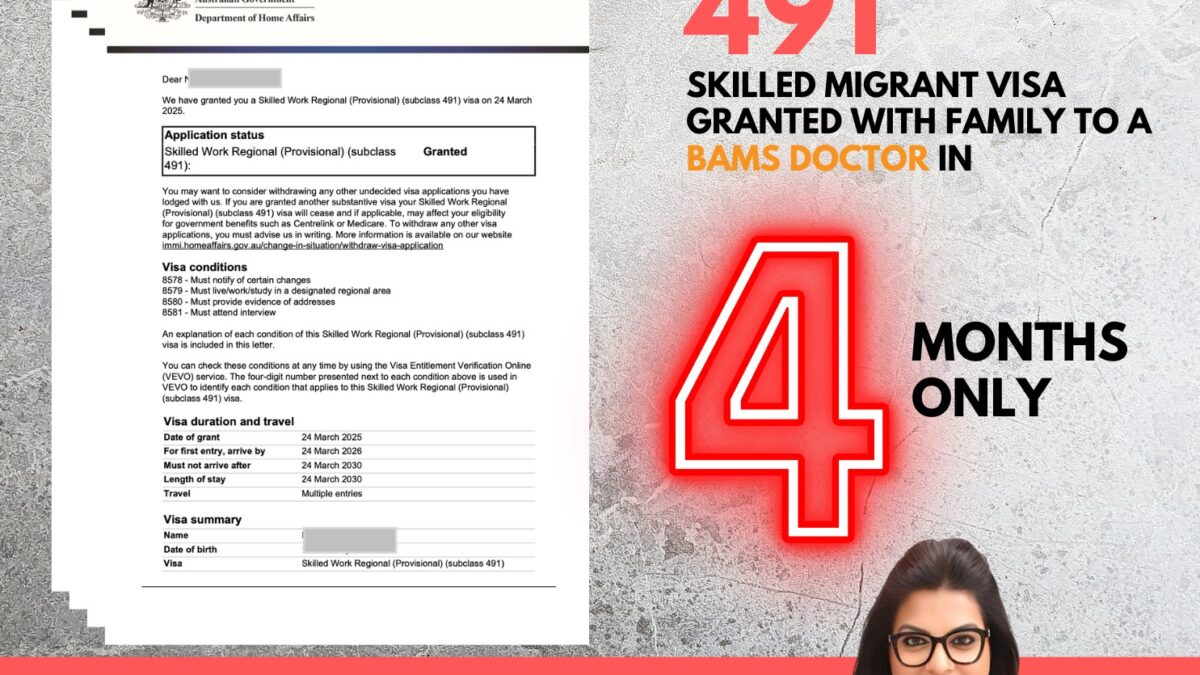 Australia continues to welcome skilled healthcare professionals through its regional migration pathways, fostering not only a diverse workforce but also promoting inclusive, sustainable communities. In a remarkable achievement, a BAMS (Bachelor of Ayurvedic Medicine and Surgery) Doctor secured the 491 Skilled Migrant Visa along with family โ all within just four months โ under the expert guidance of Caanwings Consultants Pvt. Ltd., helmed by Ms. Diamond Sodhi.