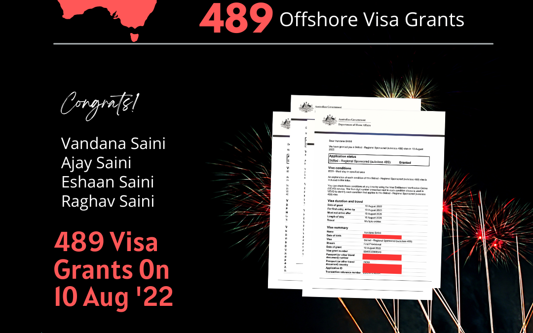Congratulations!!! August 12, 2022 489 Offshore Visa Grant. Our Heartiest Congratulations to Saini Family for getting the approval of their 489 Offshore Visa on 10th August, 2022.