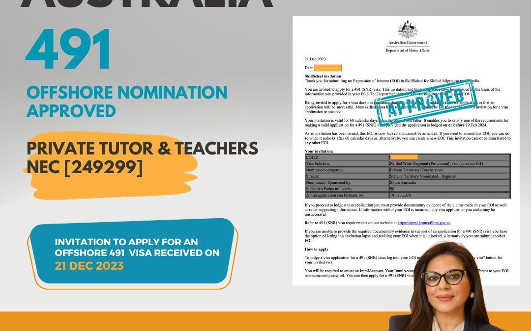 SOUTH AUSTRALIA 491 Offshore Nomination Approved For Private Tutor & Teacher NEC[249299]